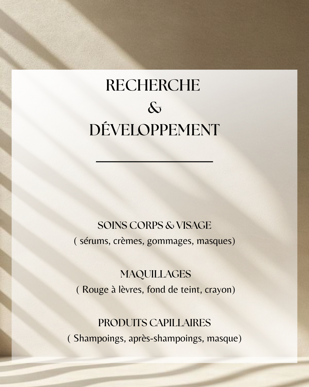 Nous travaillons main dans la main avec plusieurs laboratoires partenaires en France, afin de garantir des produits de qualité, conformes aux normes en vigueur, et prêts à conquérir le marché. Grâce à ce réseau d’experts, nous sommes capables de concrétiser vos projets du début à la fin.
